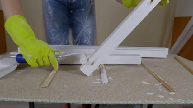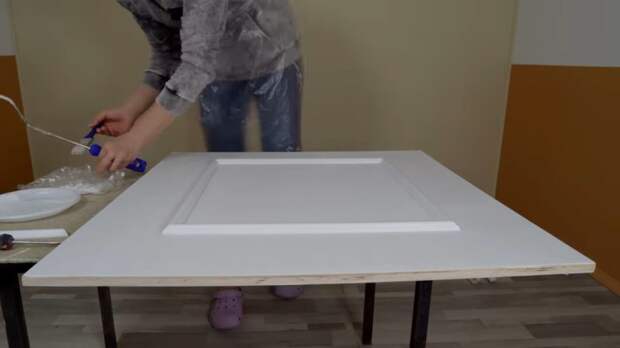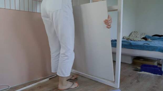 В нижнюю часть перегородки нужно закрепить отрез из фанеры. Её, в свою очередь, также нужно грунтовать и покрасить. Для декора можно приклеить молдинг.
