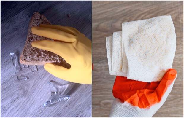 Также можно использовать бумажное полотенце. Оторвите от рулона несколько кусочков, положите друг на друга и сверните в квадрат, чтобы полотенце стало прочнее. Затем слегка смочите его водой из-под крана (важно, чтобы салфетка стала влажной, а не мокрой), и пройдитесь по тем участкам пола, где могут быть осколки. Заверните полотенце таким образом, чтобы стекло оказалось внутри, и выбросьте в мусорное ведро.