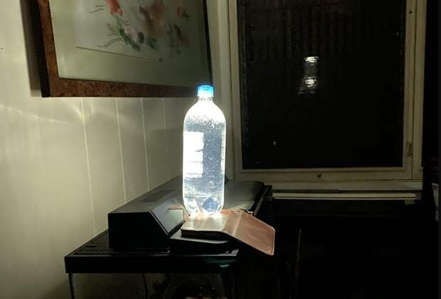 Если в квартире неожиданно отключили свет, а свечей в кладовке не оказалось, есть два варианта – сразу лечь спать, в надежде, что утром электричество уже дадут, или соорудить светильник из мобильного телефона. Не планируете отправляться в кровать? Тогда давайте заниматься «хенд-мейдом». Возьмите прозрачную пластиковую бутылку и наберите в нее воды. Далее включите на телефоне фонарик, положите его на стол и поставьте бутылку сверху. Вот так, буквально за пару минут, у вас получится небольшая, но достаточно яркая лампа, которая станет отличным помощником во время отключения электричества.