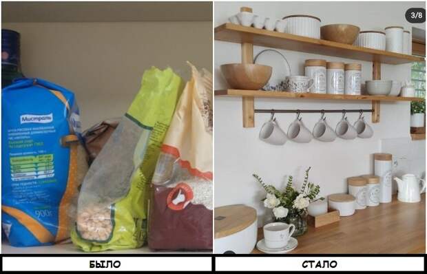 Проведите ревизию, а заодно подумайте, как можно улучшить хранение. Например, если пересыпать крупы в одинаковые прозрачные баночки и расставить на открытой полке, получится и практично, и декоративно. Также можно заменить старые пластиковые доски набором красивых деревянных изделий на подставке, и поставить их на рабочей поверхности. Отличным декором станут и эстетичные емкости для соли, перца, растительного масла, специй – тех продуктов, которые мы обычно храним на виду.