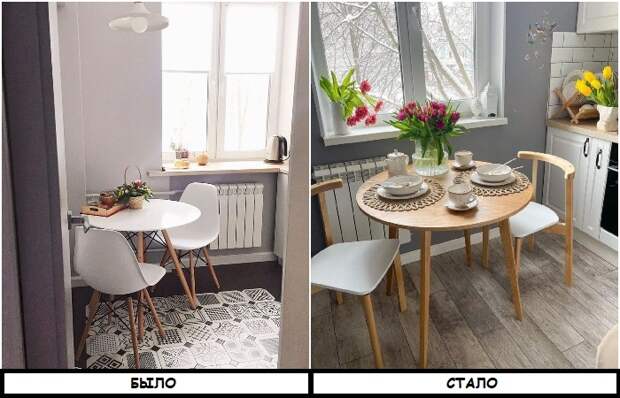 Не всю мебель, которая есть на кухне, а лишь ее часть. Это прекрасный вариант, если бюджет сильно ограничен, а перемен хочется. Например, поставьте новый обеденный стол, замените обивку на кухонном уголке, купите пару акцентных стульев. А если площадь кухни позволяет, можно не только заменить мебель, но также добавить новую. Например, в углу будет отлично смотреться функциональный стеллаж, рядом со столом – компактный мягкий диванчик. Также можно переосмыслить роль подоконника – сделать из него барную стойку, дополнительную рабочую поверхность или место для отдыха.