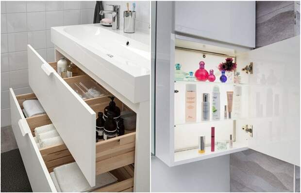 Для хранения косметики (если вы краситесь в ванной), предусмотрите отдельный ящик. Хранение в нем можно будет организовать при помощи разделителей. Казалось бы, банальная вещь, однако сколько от нее пользы: для каждой кисти, ватного диска, карандаша отведено свое место, благодаря чему они не перемещаются по ящику и не теряются в самый неподходящий момент. Кстати, разделители можно использовать и во всех других ящиках, чтобы мелкие вещи не скапливались в одну бесформенную кучу, и вам не приходилось все утро искать, например, любимые сережки.