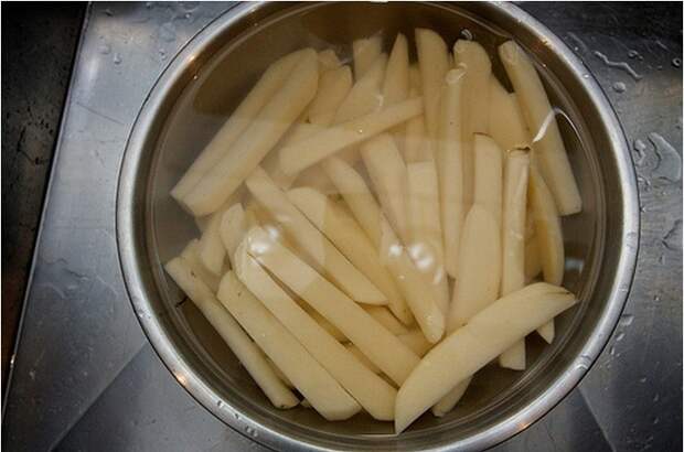 • После чистки и нарезки обязательно замачивайте картофель в миске хотя бы на 30-40 минут – холодная вода вытянет из него большую часть крахмала. Затем тщательно промойте ломтики под краном и откиньте на дуршлаг.