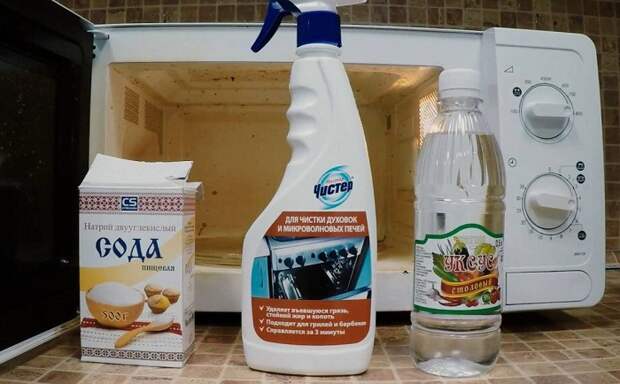 Итак, возьмите небольшую миску или контейнер, насыпьте несколько столовых ложек соды и добавьте немного уксуса, чтобы получилась густая смесь с консистенцией пасты. Нанесите ее на загрязненные участки (в том числе и на дверцу) и оставьте на два-три часа. По истечении времени налейте в пульверизатор 50 миллилитров уксуса, 50 миллилитров воды и распылите готовую жидкость на пасту. Через полчаса уберите остатки средства и загрязнений тряпкой.