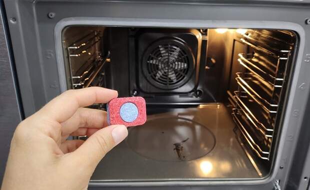 • Чтобы убрать свежие пятна, распечатайте таблетку для посудомойки, смочите ее водой, а затем пройдитесь по загрязненным участкам. Она отлично борется с жиром, поэтому быстро разберется с пятнами на дне и стенках духовки.