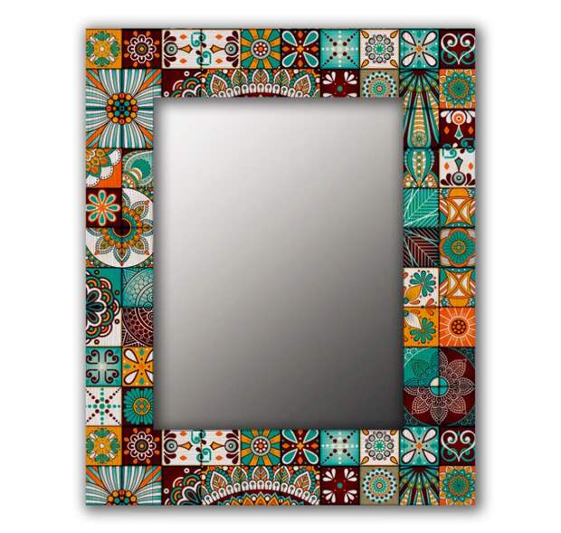Стандартная рама быстро надоедает. Оживите ее кусочками керамики, зеркальными стружками или мелкой плиткой разного цвета. Такое необычное зеркало станет центром внимания и визуально расширит комнату.