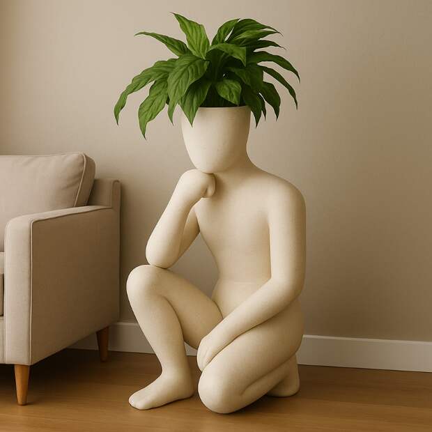 Кашпо-человечек или абстрактная фигура, в «человеческом» укрытии которого поселяется растение – смелый ход, который выделит вашу комнату. Выбирайте сочетание керамики и натурального мха или суккулентов для контраста.