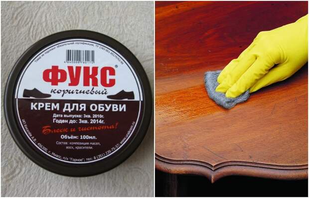 Оказывается, если под рукой нет специального воска для деревянной мебели, который помогает сохранить ее привлекательный внешний вид, можно воспользоваться помощью обычного крема для обуви. Он замаскирует царапины и хорошо отполирует поверхность. Главное, чтобы цвет крема совпадал с цветом мебели. Кстати, для получения нужного оттенка можно смешать несколько кремов разных тонов и уже после этого наносить средство на стол, стул или комод.