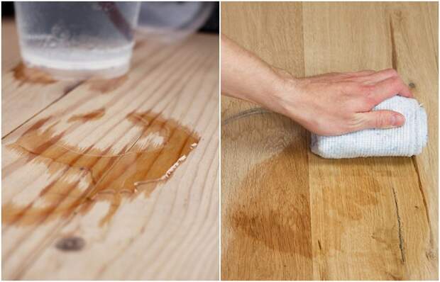 Если вы заметили, что на деревянный пол пролилось масло или капнул жир, налейте на загрязненные участки немного холодной воды. Благодаря такой обработке пятна застынут и не успеют впитаться в древесину, а значит, вам будет гораздо проще их устранить.