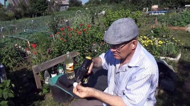 Бутылка закрывается крышкой с отверстиями. Они просверливаются сверлом 0,5 мм. Делается 5 отверстий в ряд. Заливать раствор в пульверизатор нельзя, так как деготь при высыхании его забьет.