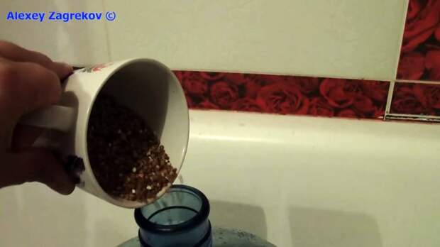 Заливаем в бутыль около двух литров воды, можно теплой, предварительно засыпав примерно горсть крупы и немного пищевой соды. После этого начинаем интенсивно взбалтывать содержимое бутыли по кругу в одну и другую сторону.