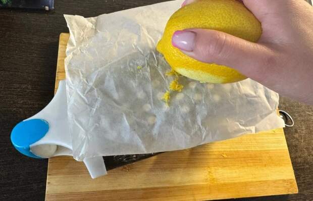 И поможет нам в этом самый обычный пергамент. Просто постелите его сверху терки, а после натрите на ней лимонную цедру. Она прекрасно измельчится и при этом останется на пергаменте. Это не только позволит экономно использовать цедру, но и аккуратно переместить ее в готовящееся блюдо. Ведь с пергамента это будет сделать намного проще.