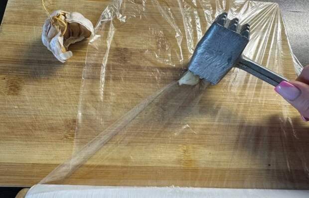 Разместите головку чеснока на разделочной доске и накройте его пищевой пленкой. После чего возьмите молоток и аккуратно постучите по нему. Так вы быстро раздавите чеснок, при этом не замарав всю кухню. Шелуха и сок останутся под пленкой и не смогут ничего запачкать.