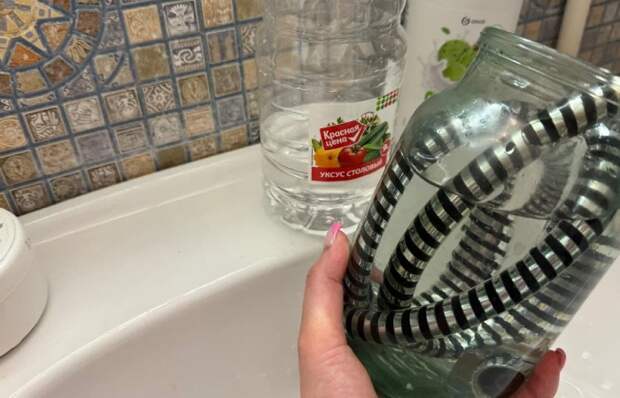 Шланг необходимо снять и поместить в банку. Лучше всего подойдет обычная стеклянная банка, но это может быть и любая другая емкость, которая вместит в себя шланг. Далее его необходимо залить уксусом. В таком виде оставляем шланг на час, а лучше на всю ночь. За это время уксус прекрасно растворит все загрязнения и налет. А с утра вам останется лишь сполоснуть шланг под теплой водой и установить его на место.