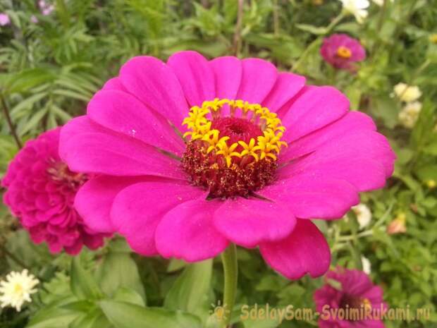 Цинния — растение южноамериканского происхождения, которое отлично подойдет как для украшения балкона (низкорослые сорта), так и сада. Своим названием циннии обязаны ботанику Иоганну Готфриду Цинну. Растение прекрасно переносит холодные осенние ночи и дождливую погоду, однако для полноценного развития требуется внесение удобрений и размещение на хорошо проветриваемом и освещенном месте. Цветки разной окраски и округлая форма соцветия — отличительные черты этого великолепного представителя семейства Астровые. Цветение начинается с начала июля и продолжается по сентябрь. Срезанные цветы могут стоять до 10 дней в вазе, а также прекрасно смотрятся в сочетании с подсолнухами.