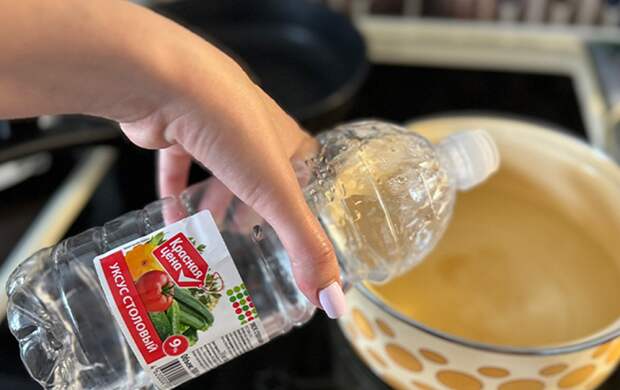 Налейте уксус в кастрюлю и поставьте на плиту