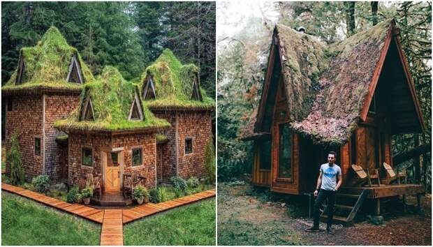 Шестигранный домик, «задрапированный» мхом, выглядит поистине волшебно (Diamond Cabin, США).