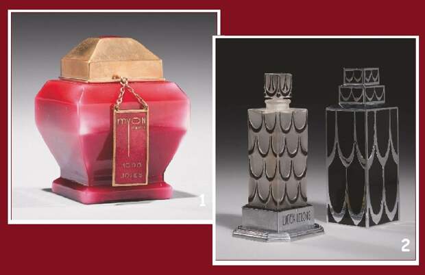 1.Mуon. 1000 Joies. 1928. Высота 9 см. Christie’s, март 2011 года. 5 тыс. долларов. / 2.Р. Лалик для «Lucien Lelong». Parfums A, B, C, J ou N. 1929 год. Высота 10 см. Christie’s, март 2011 года. 23 тыс. долларов.