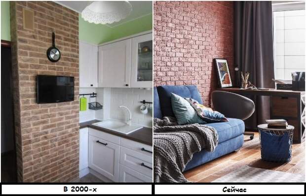 В начале 2000-х годов на рынке появилось много новых строительных материалов, призванных ускорить и облегчить ремонт, сделать его более бюджетным. ДСП, пластик, самоклеящаяся пленка – благодаря низкой цене, каждый мог себе их позволить, поэтому материалы стали невероятно популярными. Чаще всего в квартирах можно было встретить имитацию дерева или камня, обои с рисунком кирпичной кладки. Понятно, что выглядело это не слишком достоверно, и зачастую портило и удешевляло интерьер, поэтому вскоре от тренда отказались.