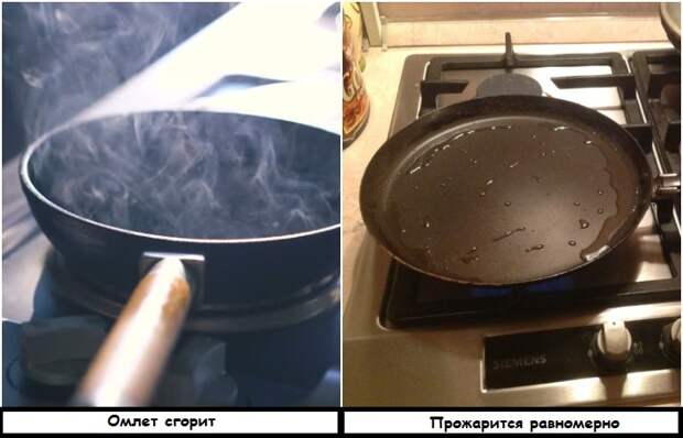 Сковороду для омлета нужно хорошо нагревать, но не перегревать. Если дно будет слишком горячим, яйца моментально схватятся и снизу образуется жесткая неаппетитная корочка. Чтобы не допустить этого, поставьте сковороду на средний огонь и разогревайте около минуты. Важно, чтобы он нее не начал идти едва заметный дым – это верный признак того, что она перегрелась. Если это произошло, уберите посуду с конфорки на пару минут, чтобы она слегка остыла, а уже потом выливайте взбитые яйца.