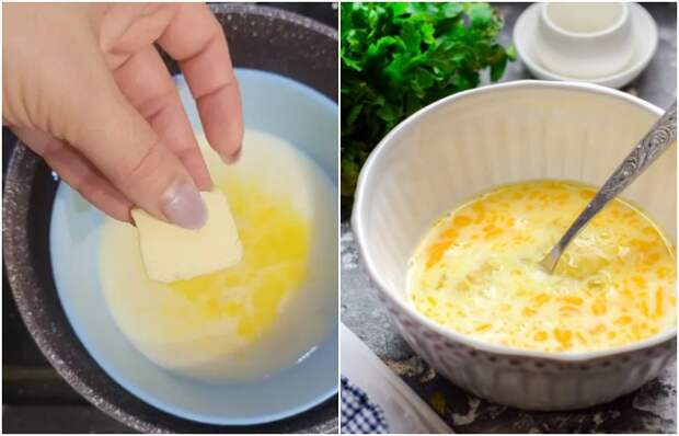 Обратите внимание, что масло нужно заранее достать из холодильника, чтобы оно приобрело комнатную температуру. Так продукт равномерно распределится между другими ингредиентами и не даст омлету расслоиться. А вот растапливать его на водяной бане или в микроволновке нежелательно. Также не стоит использовать соленое сливочное масло – оно может нарушить баланс вкуса.
