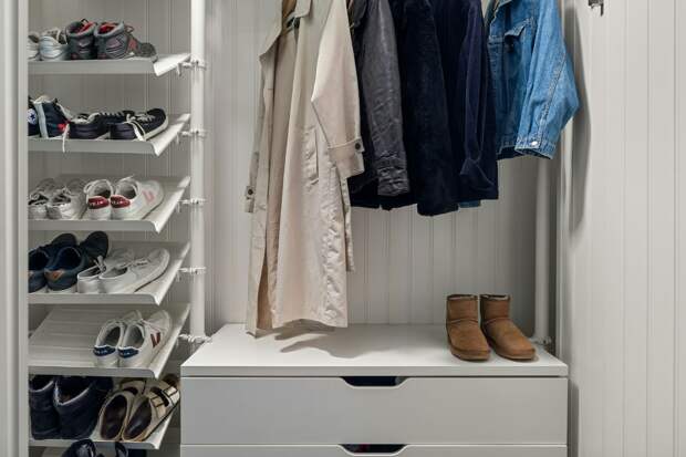Классика, которая спасает интерьер от хаоса. Обувь надежно спрятана, а благодаря регулируемым полкам можно хранить и сапоги, и кроссовки.