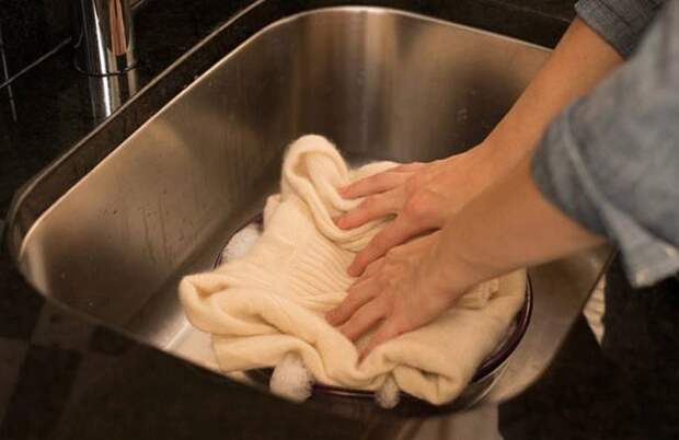 • Температура. Первое, и самое главное, – это температура воды, а также отсутствие перепадов. Если вы будете стирать шерстяные изделия в прохладной воде, а полоскать в горячей, процесс деформации будет неминуем – волокна сожмутся, и вы достанете из таза свитер на несколько размеров меньше. Идеальной является вода комнатной температуры, и ее нужно использовать на всех этапах стирки, начиная от замачивания и заканчивая полосканием.