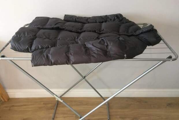 Чтобы после стирки в материале не осталось моющего средства, запустите дополнительный цикл полоскания. Сушить пуховик лучше на столе или любой другой горизонтальной поверхности подальше от горячих батарей и других источников тепла. Идеальный вариант – сетчатая сушилка, так как она позволяет воздуху равномерно циркулировать со всех сторон. Чтобы ускорить процесс сушки, подложите под пуховик махровое полотенце, и меняйте его по мере намокания.