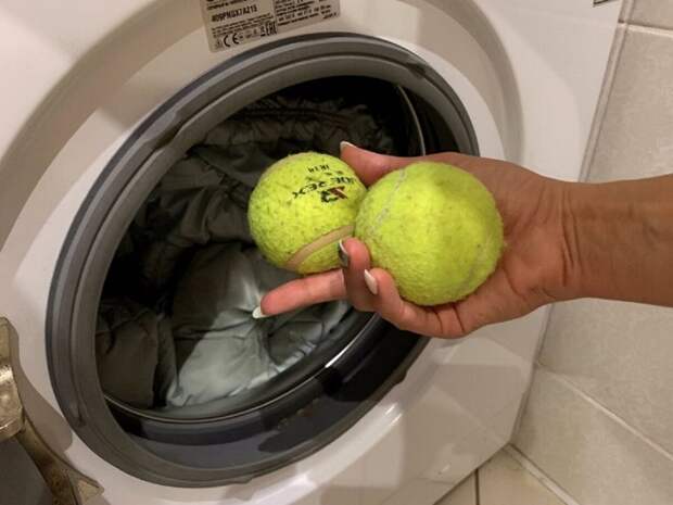 Пожалуй, самый главный и эффективный лайфхак – класть в барабан специальные шарики для стирки, изготовленные из силикона или полипропилена, либо обычные теннисные мячики. При вращении барабана они ударяют по ткани и не дают пуху сбиваться в комки. Кроме того, шарики помогают наполнителю равномерно промываться. Оптимальное количество для стирки – три или четыре штуки (зависит от размера пуховика).