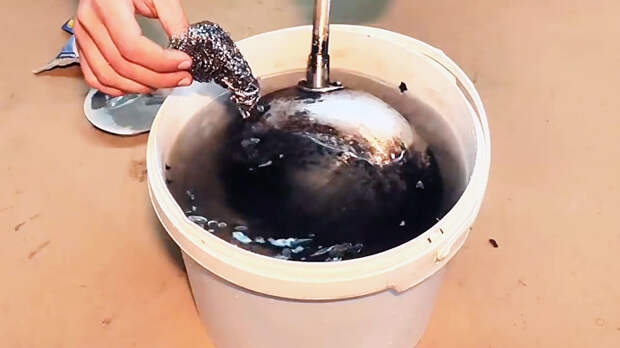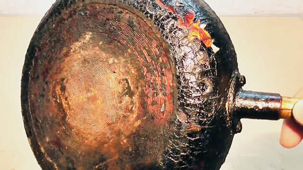 После того, как нагар выгорит и отслоится почти полностью, не дав остыть раскаленной сковородке, быстро погружаем ее в емкость с холодной водой. Резкий перепад температуры также способствует очистке посуды от нагара.