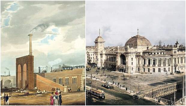 Старинное здание Царскосельского вокзала и его приемник, спроектированный архитектором С. А. Бржозовским (Санкт-Петербург).