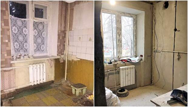 С чего все начиналось: Проанализировав имеющееся пространство, выбрав самые интересные идеи и впечатляющие детали молодые люди принялись за работу. Чтобы полностью трансформировать кухню, пришлось избавиться от остатков мебели и техники 70-х годов, демонтировать керамическую плитку, штукатурку, напольное покрытие и стену, граничащую с жилой комнатой, заменить деревянную оконную раму на стеклопластиковое окно, а также поменять радиатор, водопроводные и канализационные трубы, ведь всему этому оборудованию не один десяток лет и оставлять его было совсем нецелесообразно. Поскольку инженерные коммуникации портили внешний вид, их спрятали за гипсокартоном, после чего остался лишь небольшой выступ, но основная часть стены была идеально ровной и свободной.