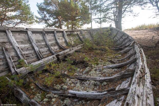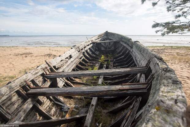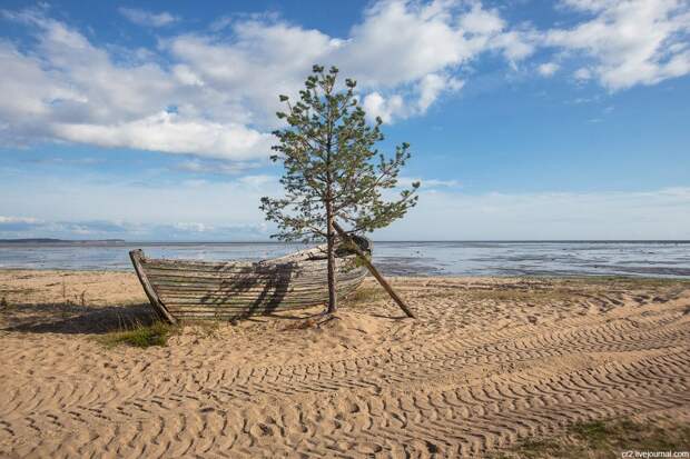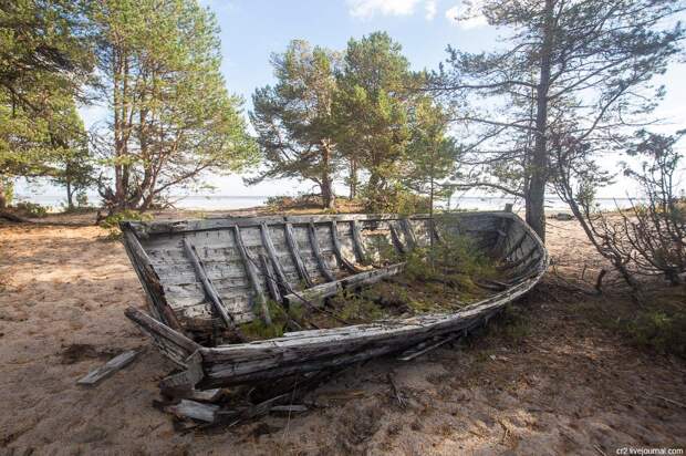 Это поморское село Пурнема, где сохранилась старинная деревянная шатровая церковь и «кладбище карбасов» на берегу Белого моря.