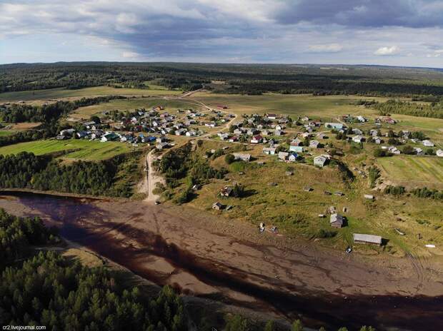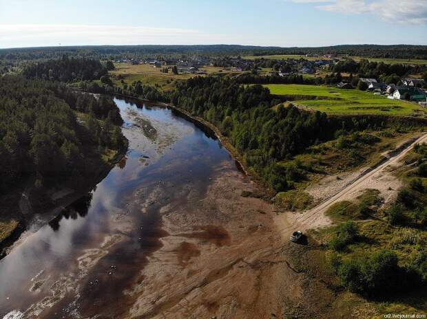 От достаточно широкой реки Пурнемы остаётся лишь небольшая часть с течением средней величины. При желании можно даже переехать на машине, но мы заниматься этим не стали, куда интереснее перейти, разувшись, пешком. Дно песчаное, грязи и месива нет. На том берегу часть села Пурнема, в народе именуемая Низовьем. Как нетрудно догадаться, Верховье находится рядом, оно слева от Низовья. Там и стоит старинная церковь. Из одной части села в другую можно попасть в объезд по дорогам (они видны на фотке), а можно пройти по небольшому подвесному пешеходному мосту, перекинутому через овраг (овраг слева на фотке, там где-то должен располагаться и мост).