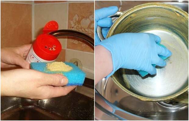 Насыпьте сухую горчицу прямо на губку и помойте кастрюлю