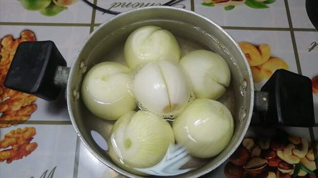 Разрежьте лук на половинки и прокипятите в кастрюле