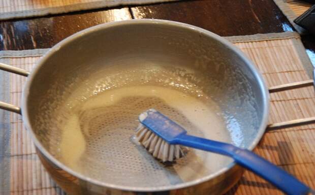 На заметку: Чтобы убрать нагар на внешней стороне посуды, прокипятите ее в мыльном растворе. Для этого возьмите большую кастрюлю, добавьте в нее пять литров воды, и по пять столовых ложек стирального порошка и средства для мытья посуды. Поставьте на плиту, дождитесь, пока жидкость закипит, после чего опустите туда грязную посуду. Кипятите около 20 минут – этого будет достаточно, чтобы нагар отошел от стенок.