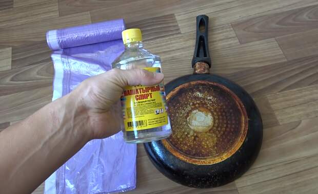Итак, чтобы привести грязную сковороду в порядок, положите ее в несколько мусорных или обычных пакетов (предварительно открутив ручку), и налейте 50 миллилитров нашатырного спирта. Хорошо завяжите пакеты и несколько раз встряхните их, чтобы жидкость равномерно распределилась по посуде. Вынесите сковороду на балкон и оставьте там на ночь. Утром достаньте ее из пакетов, протрите влажной губкой и ополосните чистой водой – от загрязнений не останется и следа.