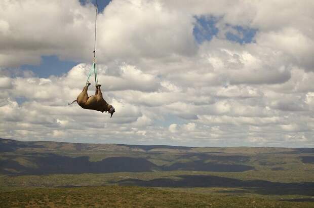 Нередко в Африке можно наблюдать картину, когда в небе парит вертолет с носорогом, подвешенным вниз головой. Незнающий человек может расценить такой способ транспортировки как издевательство над животным. Но на самом деле, все совсем не так. Зачем же африканцы это делают?