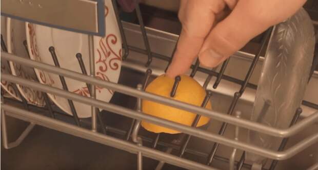 Чтобы лимон не затерялся внутри посудомоечной машины, лучше всего закрепить его на решетке для посуды. Теперь можно запускать привычную программу «стирки».