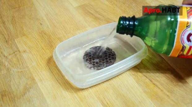 Чтобы процесс протекал интенсивней, сетку можно потереть после того, как она пролежит в уксусе несколько часов, а заливку заменить на новую. Для удаления ржавчины из отверстий прочищаем их зубочистками.