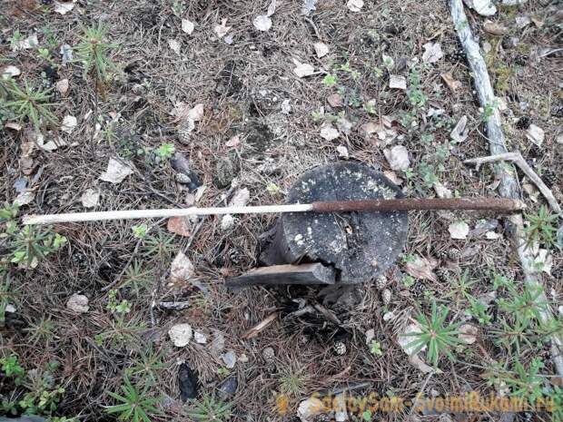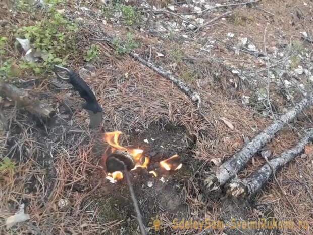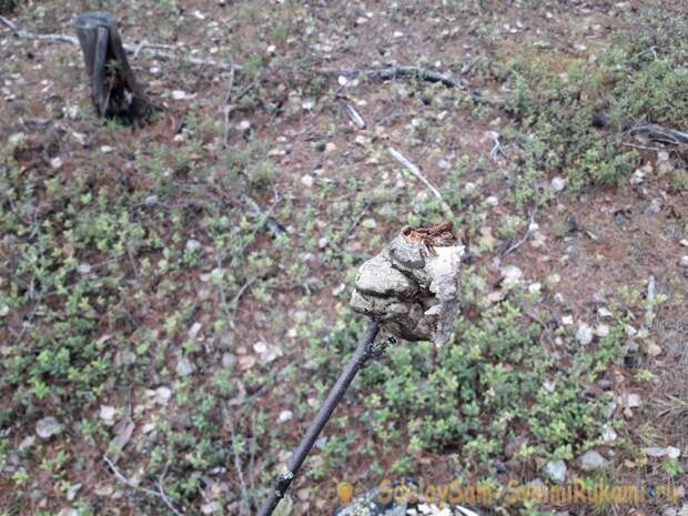 Теперь поджигаем край гриба, и втыкаем ветку в землю, метрах в пяти от стоянки.