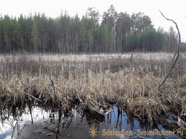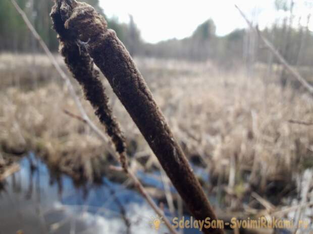 Итак, нужно сорвать на ближайшем болоте, несколько головок прошлогоднего рогоза. Желательно, на небольшом стебле.