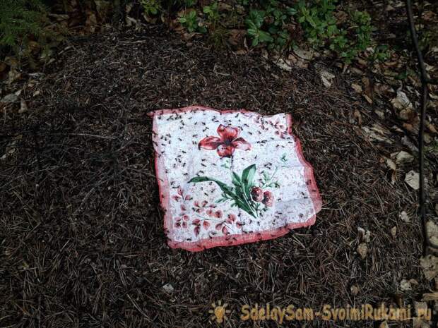 Всё предельно просто: кладём носовой платок, в развёрнутом виде, прямо на муравейник.