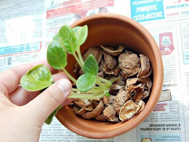 Измельченная скорлупа грецкого ореха может использоваться в качестве дренажа для комнатных растений.