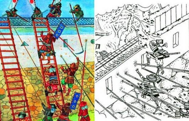 Так для чего же японские войны ковыряли копьями «саку»? Дело в том, что воткнуть копье в древо-земляную изгородь действительно было не очень сложно. Делалось это для того, чтобы сформировать на стене эрзац-лестницу, по которой через ограду могли взобраться воины. Японцы вбивали в изгородь десятки и сотни копий. Такая «осадная конструкция» оказывалась достаточно прочной и надежной для того, чтобы бойцы могли перелезть через преграду.