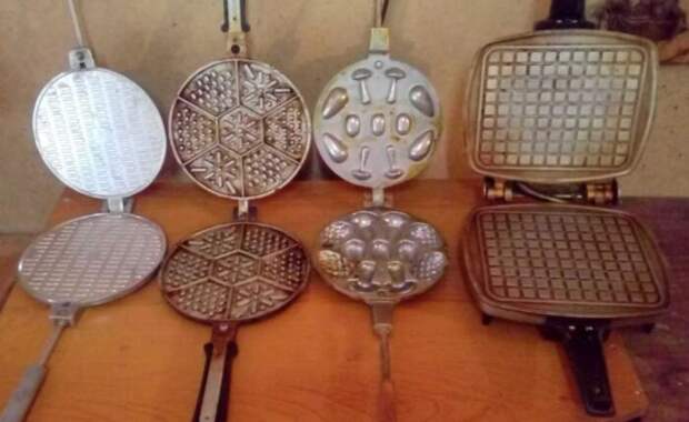 Похоже на сковородку, не так ли? Как это странно не прозвучит, но это и есть сковородка! Просто необычная. На самом деле это вафельница для приготовления выпечки в домашних условиях. Были в том числе вафельницы с узором как у «бельгийских»! Делать выпечку можно было, в том числе с начинкой внутри. Например, со сгущенкой.