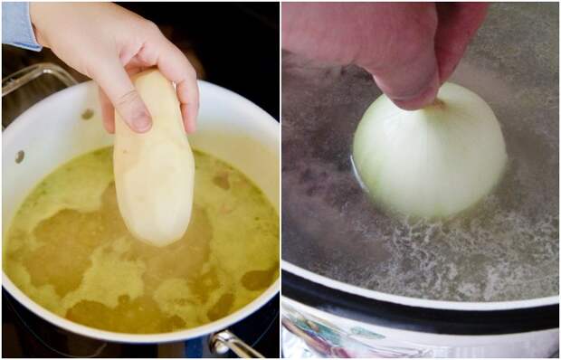Все, что вам нужно сделать – это очистить одну большую или несколько средних картофелин от кожуры и положить в кастрюлю с супом. Проварите его десять минут и достаньте шумовкой. По этой же схеме можно использовать лук. Очистите головку от шелухи, а затем опустите в бульон на десять минут – блюдо станет менее соленым.